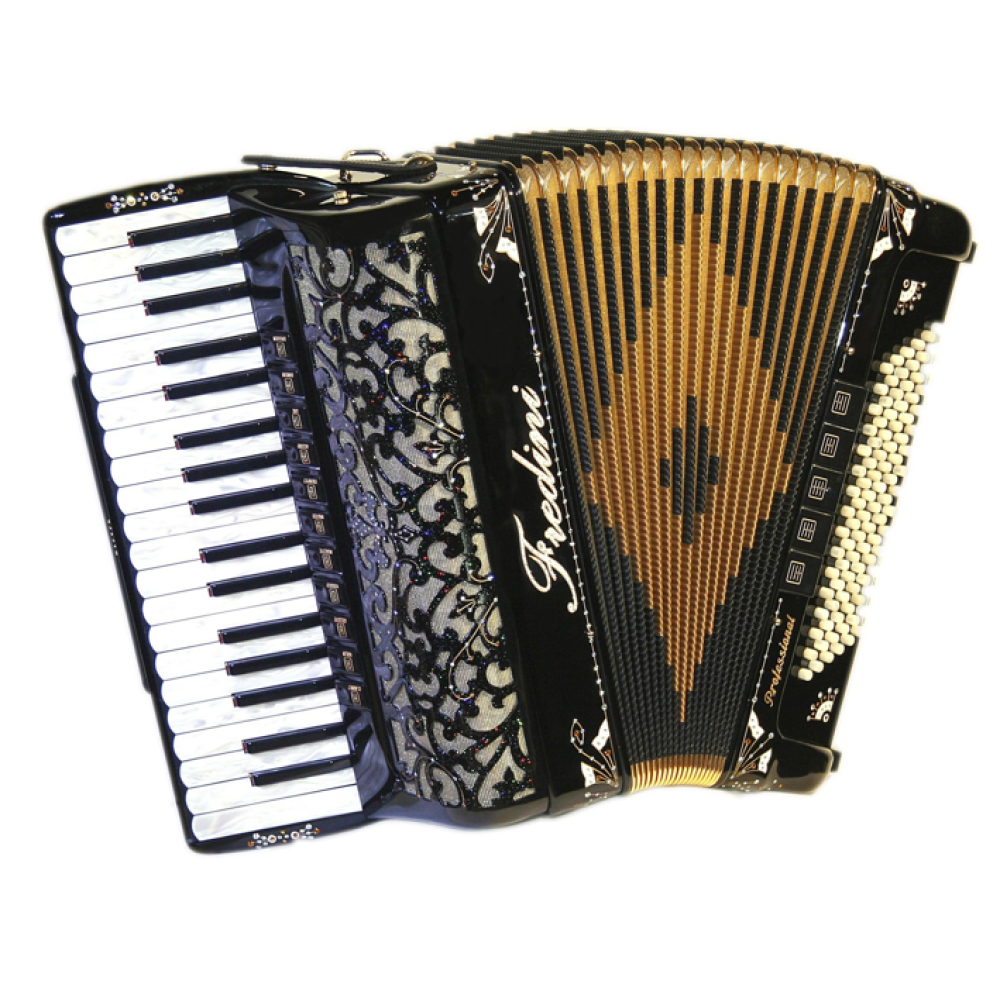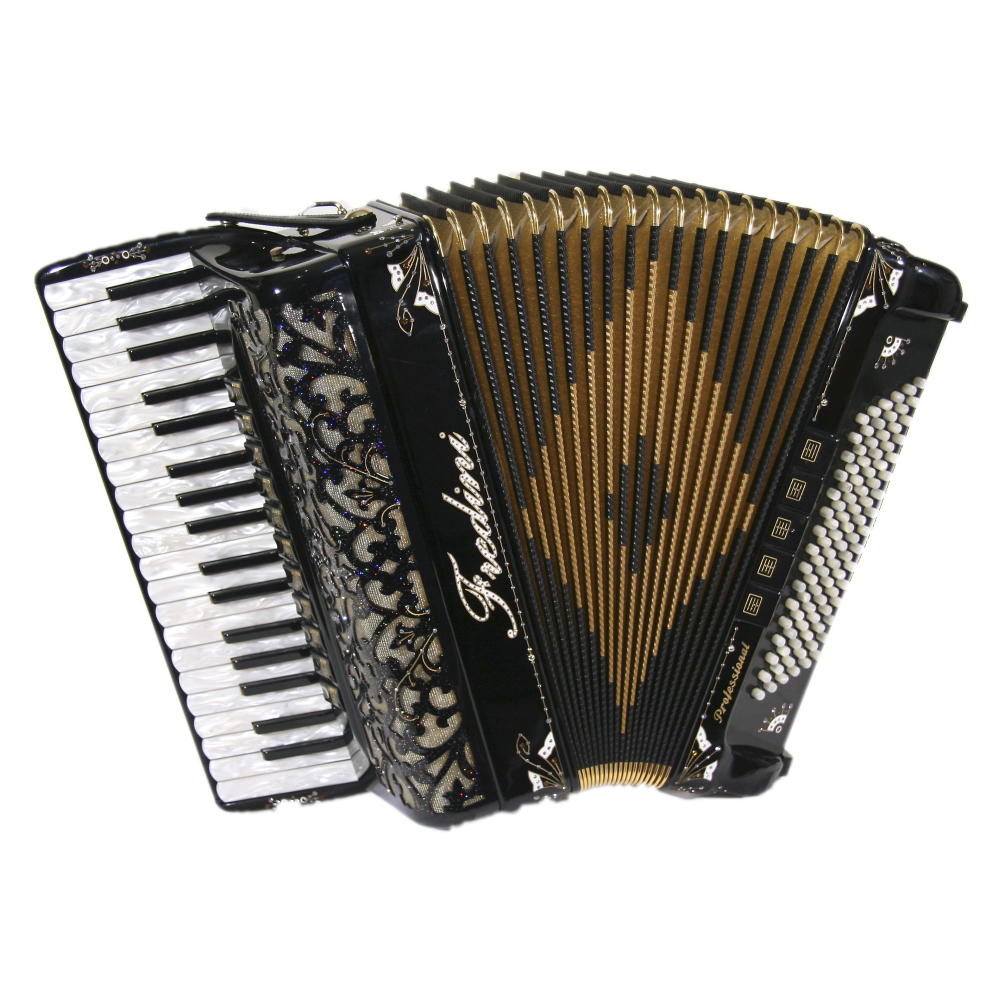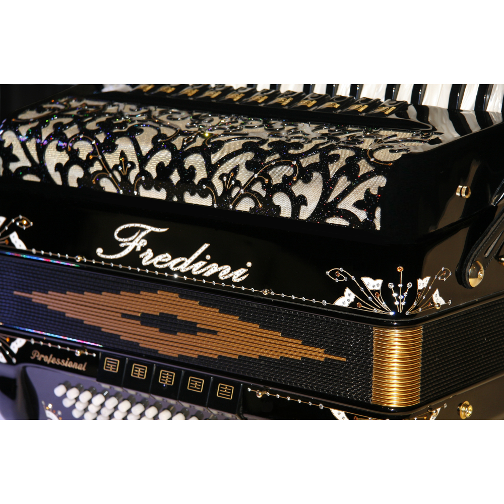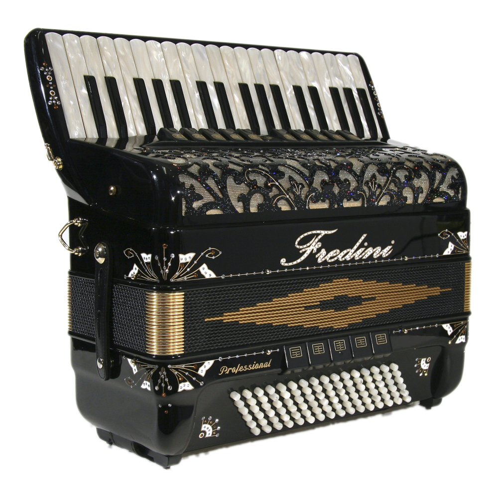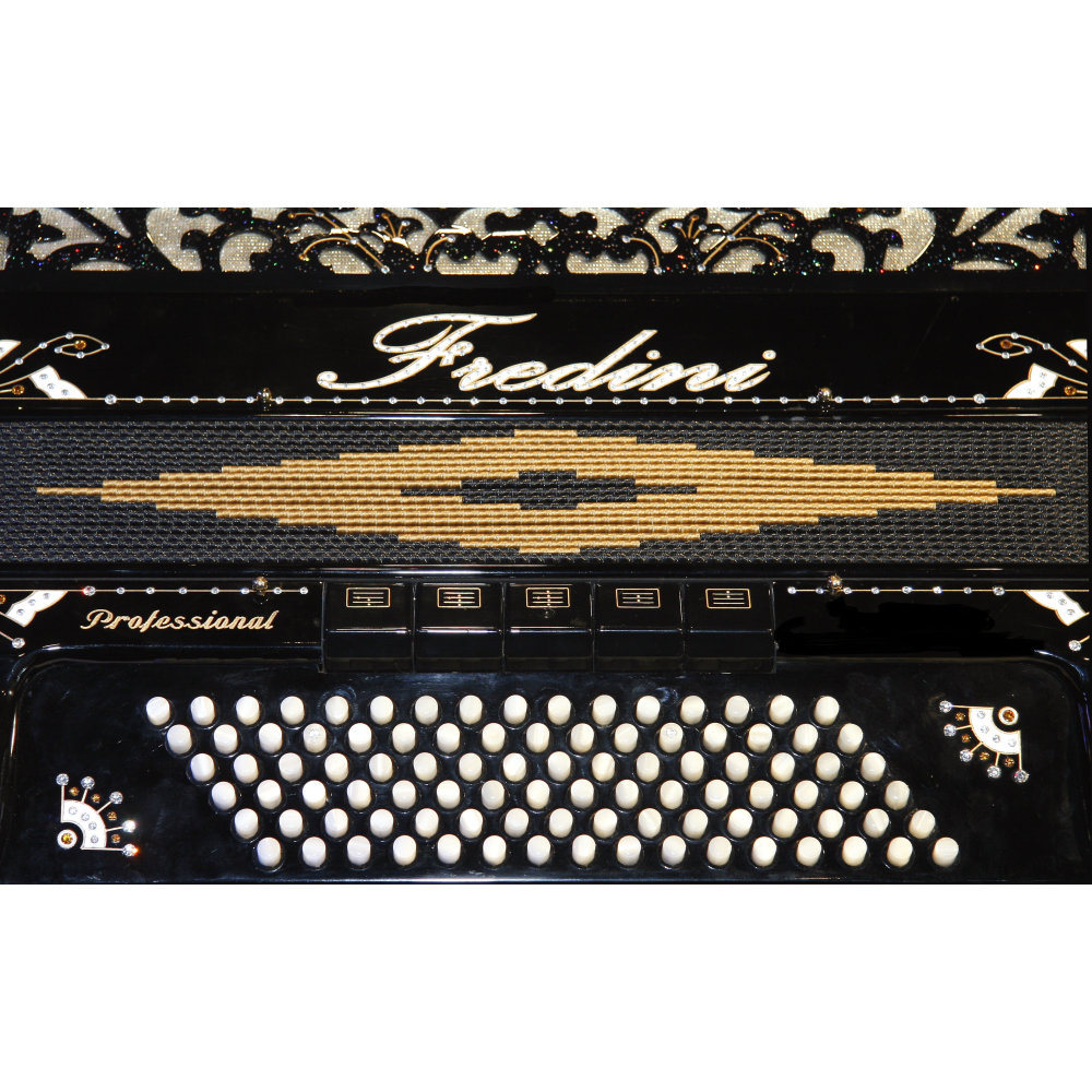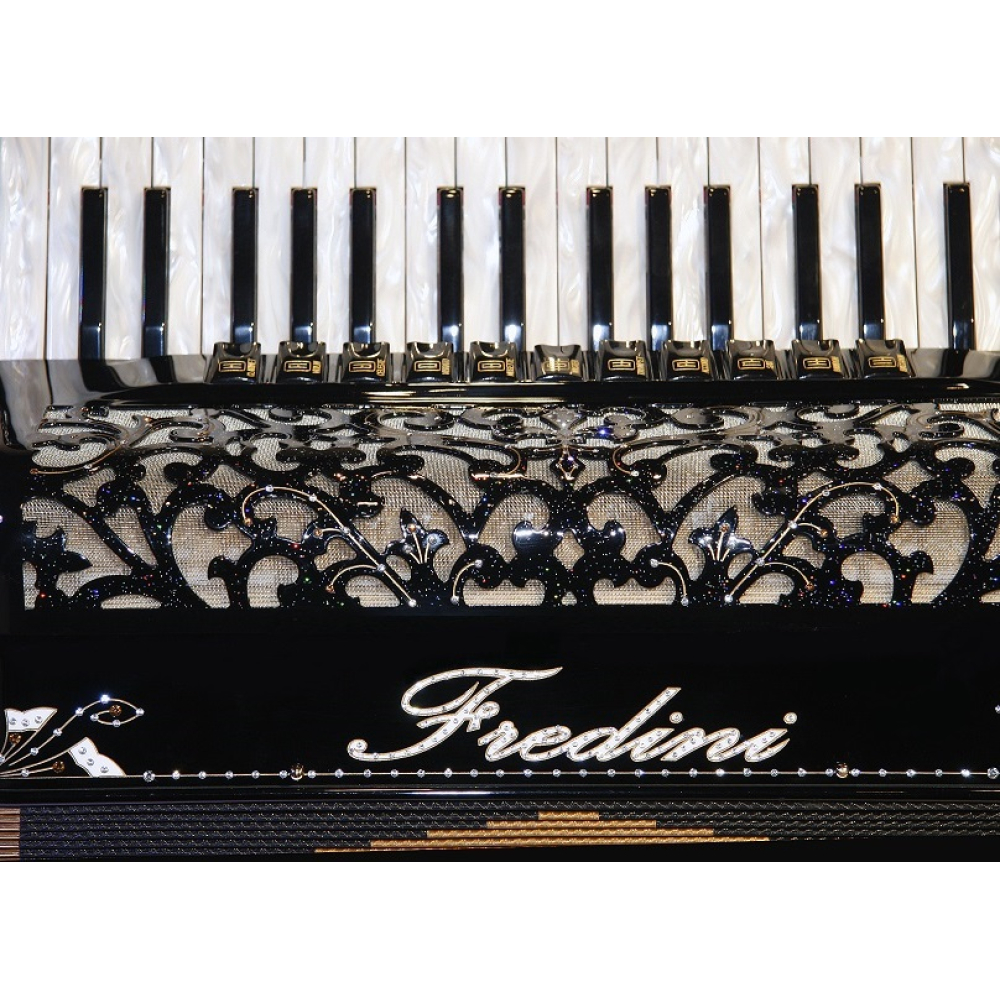 Fredini accordeon met 96 bassen, 37 toetsen en dubbele klankkamer, 11 registers + masterregister, octaafstemming, 5 registers baskant.