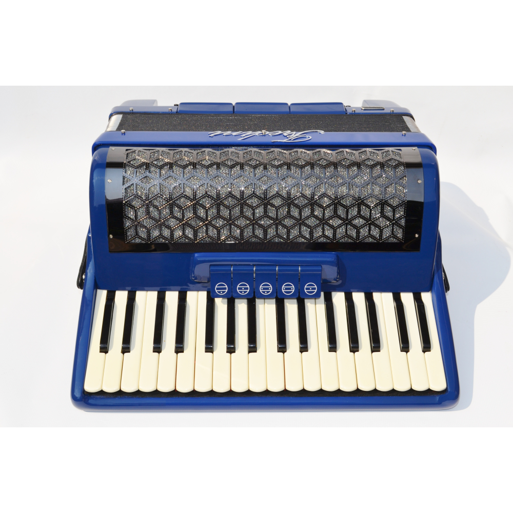 Gereviseerde occasion in ons eigen atelier hersteld. Italiaanse 3 korige accordeon met 80 bassen. Fraai uitgevoerd in deep blue met dark-chrome grill. Musette 16-8-8 met musette zweving. Perfect instapinstrument. Geleverd met 3 maanden garantie.